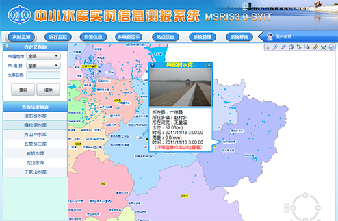 中小水库实时信息测报系统是一个水雨情、实时视频监测的一体化系统。系统由信息采集硬件设备(含:摄像机、雨量计、水位计、RTU、太阳能供电系统)以及接收和应用软件组成。系统采用光纤或3G网络进行传输,可以流畅地传输现场实时视频、水雨情实时数据。同时利用客户端软件,随时方便地在互联网和移动终端上掌握水库水雨情和视频信息。本系统于2012年9月获得中国国家版权局计算机软件著作权登记证书。
