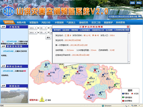由前端数据采集设备、供电设备、传输设备和监控中心组成,前端安装在水库或水电站的数据采集主机将采集到的视频图像、水位、降雨量、水温、气压等数据通过GPRS或4G等无线方式传输到监控中心,监控中心软件可以显示并分析前端设备采集的数据,当出现警情时会发出预警信息,提醒相关指挥人员做好抢险救灾工作准备。
